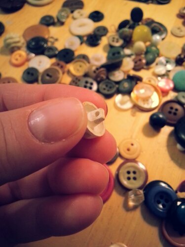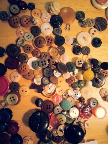 So after your happy button hunting gleefully dump them out across the table and start sorting! No? Too messy? Then timidly and neatly pour them onto a paper plate or into a bowl or something equally boring. Some buttons will stand on their own while others will look great stacked two or three high.