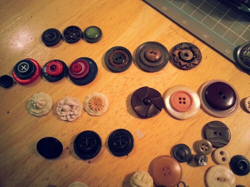 -vintage and/or new buttons usually no larger that 1 1/4″ . Both sew through and shaft buttons are fine as long as the shafts can be cut off.
