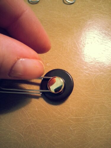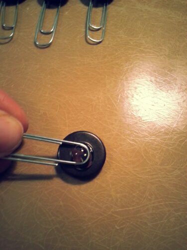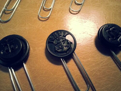 If the top of your button stack finishes with a sew through button, cover the tiny holes with a aptly placed bling or fill them in with a few passes with the needle and thread to keep the hot glue from coming through. Use your hot glue (set on high) to glue your stacks of buttons and bling together. Once your stacks are all set, flip them bad boys over and apply a healthy dollop of hot glue and set your paper clip.