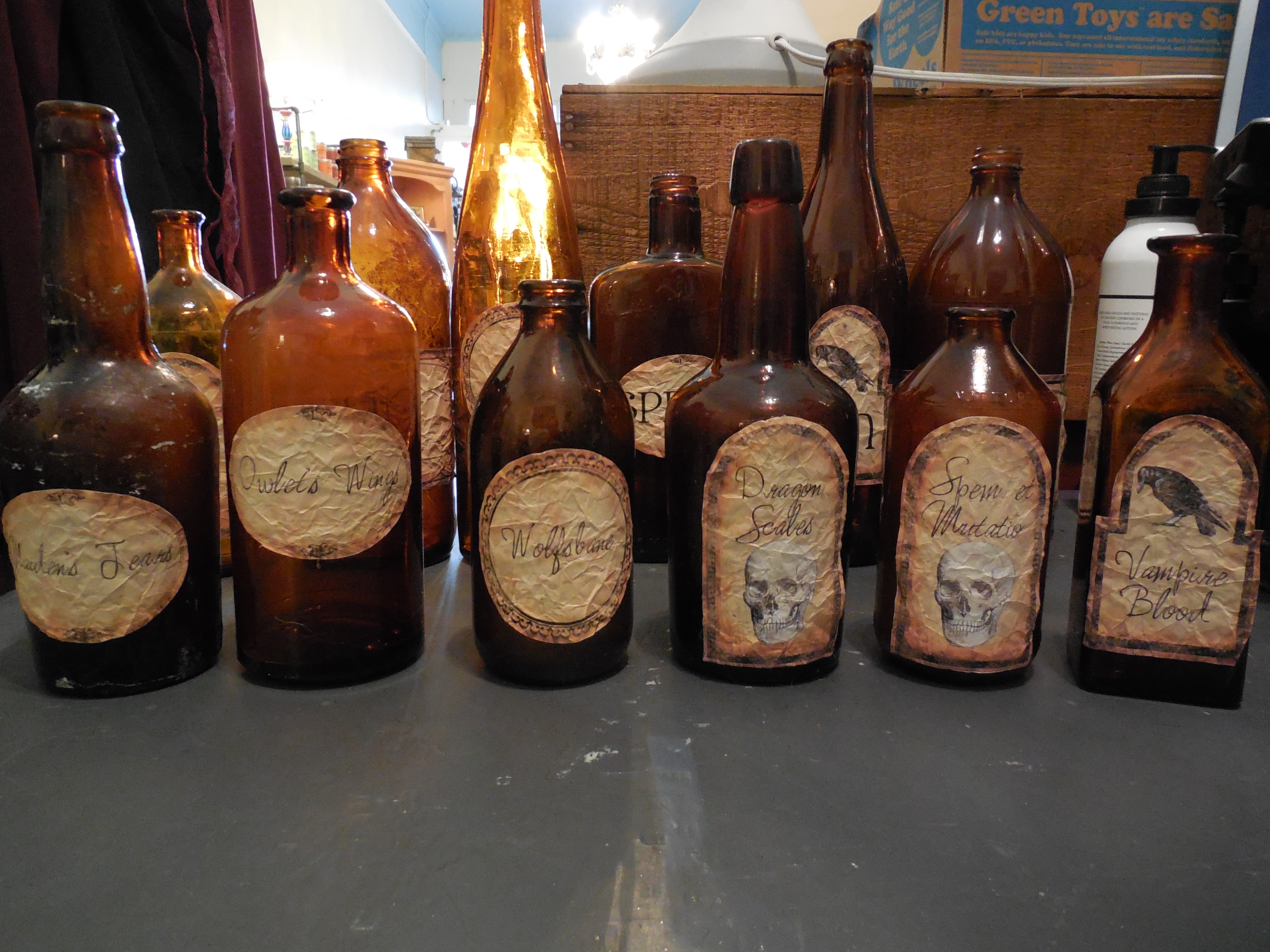 Anyway, I wanted to include the actual name of the theme in the window but I didn’t feel like using my usual go to… a banner. Don’t get me wrong, I LOVE making banners! I’m the woman that anytime she hears someone is engaged, having a party or giving birth to a baby decides that the one and only touch that they need to make the event perfectly special is a BANNER. But it just didn’t feel right for this project so after mulling it over I decided to do apothecary labels on old bottles. Luckily enough, my best friend just got married (YES, we made a banner for the wedding). Her and her lovely fiance had fun collecting old amber colored glass bottles for the center pieces and it just so happens they are out of town on their honeymoon and I have the key to their house. Sooooo…. I didn’t have to go searching all over and back for bottles. Thanks newlyweds! 🙂