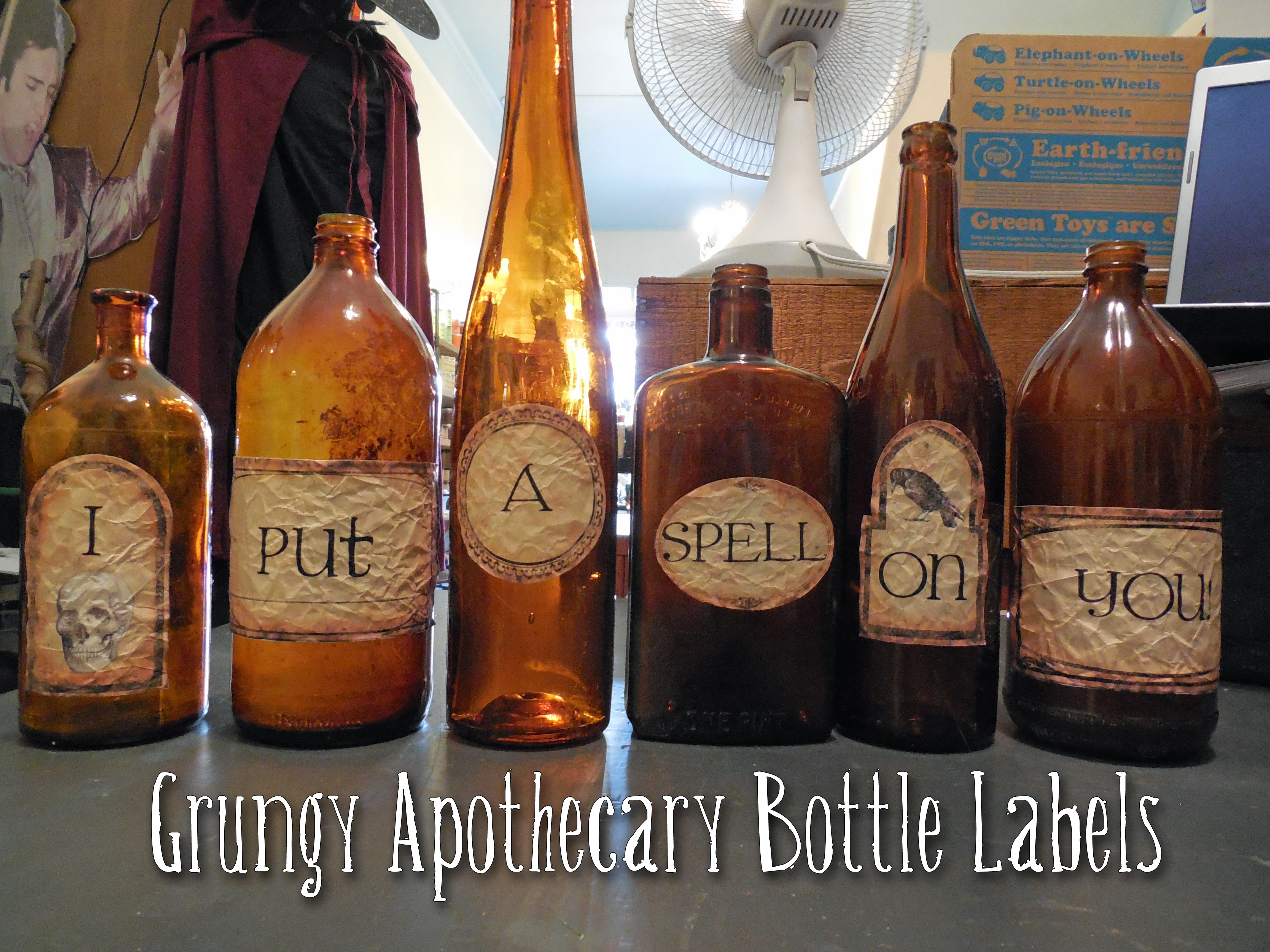 I found some affordable digital blank apothecary labels here and went to town on them with Photoshop. The borders and clip art looked a little too new against the cool grungy label backgrounds so I swiped at them with the eraser using a texture brush set at 25-50% opacity. I purposely left the wording alone because I wanted them to stand out from the label… it’s hard sometimes to get people to catch smaller details in a display window so you have to give up a little subtlety for the sake of communicating the message. They still look pretty nifty though!