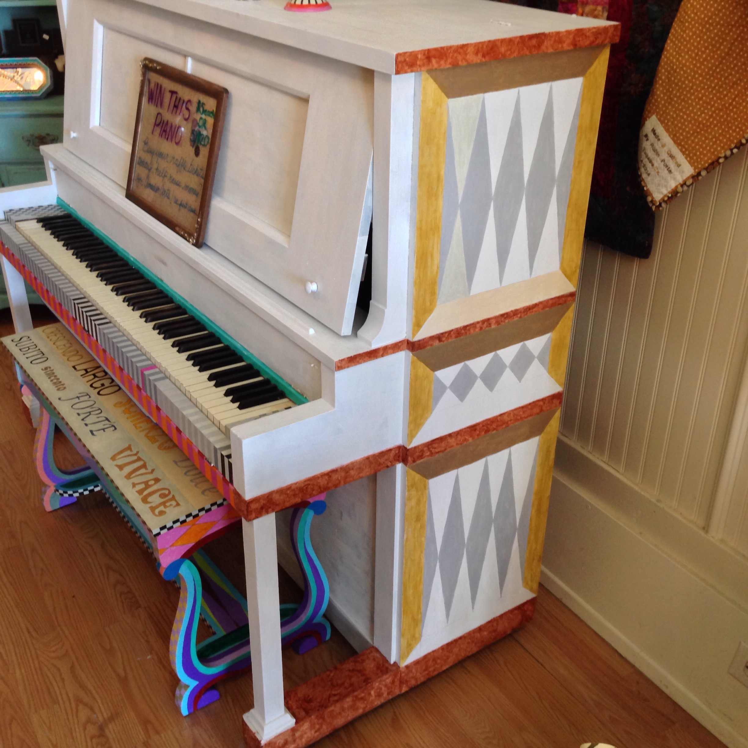 Well, well… who knew watching Charleen paint the piano would be such a learning opportunity? It has been so wonderful to finally get the ball rolling and have Charleen here painting away on a regular basis (could I have taken any longer to get the damn thing sanded and ready for Charleen?). Her and I have both enjoyed having curious customers, art lovers and even children drop in to chat and observe while she works. More times than not, I still have to encourage observers to imagine the finished piece because they mistakenly think the primer white is all the painting she plans to do. (?)