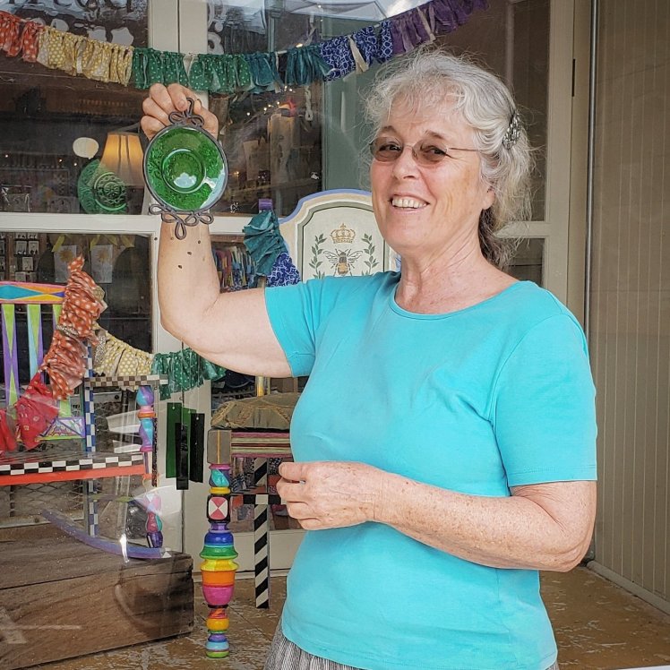 This lovely lady, Susan came by the shop a few weeks ago. She was hoping to find a new Christy McAdams Chime to replace the one she lost three years ago when her home burned in the Butte Fire. (Yes, it takes YEARS to rebuild and replace) My heart broke as her face fell with disappointment when I told her that Christy doesn’t make the depression glass chimes anymore. HOWEVER! You guys know I shop my own store A LOT, so… I just happened to have two sets of chimes of my own at home in the color she was hoping to find. Now this little emerald beauty that hung in my kitchen has found a new home with Susan! I hope it brings her much joy in her home for many years to come! #welcomehome #thisisgifted